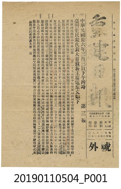 本文物年代為戰後初期,報刊名為重建日報。文物右側有小字「經中華郵政登記認為第類新聞紙類」,該報社長為蘇泰楷。本報為號外形式,時間為民國36年3月3日下午4點,標題為「臺灣省民眾代表大會致蔣主席電原文」。電報內容大致為「二月二十七日夜,本省專賣局派員率警察大隊在臺北市延平路查緝私菸,開鎗搶奪,民眾甚為憤慨……長公署衛兵突朝民眾開槍掃射……自光復以來政治惡劣,軍警公務人員不法行為,此乃造成二二八慘案之原因」。