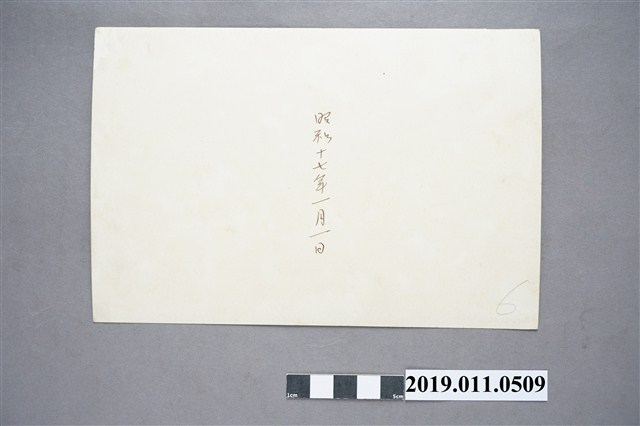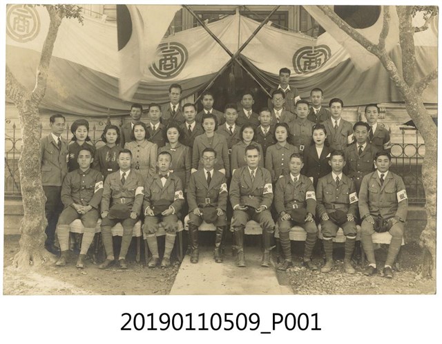 本文物日治時期的黑白相片,其保存良好。相片中有24名男士及8名女性,所有人皆穿著西式服裝,其中男性的右臂綁著寫有「(商)銀」等字。人群後方可見兩面交叉擺放的日本國旗及印有「商」字的布條。