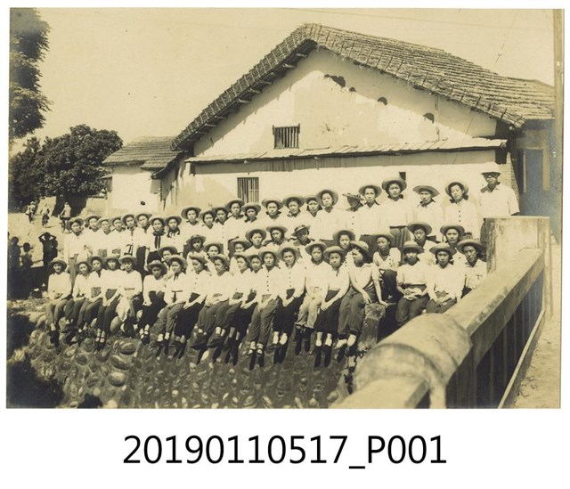 本文物為日治時期的黑白相片,其保存狀況良好。相片中有數十名女學生及一名男老師,其中女學生皆有戴帽子,且幾名學生的制服為水手服形式。相片背面的四個角落有撕毀的痕跡,其右上寫有「六」字,右下角則有「大肚山皇軍南屯にこ」等字。