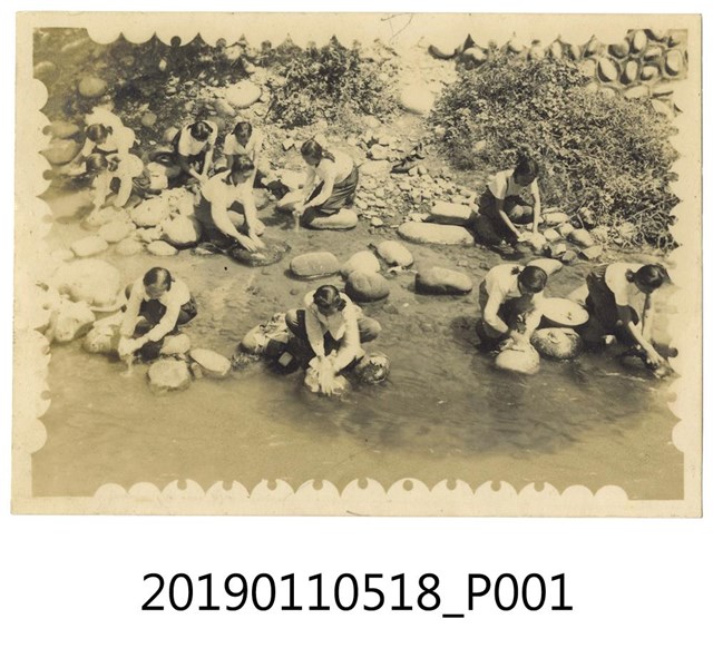 本文物年代不詳,為一黑白相片,其保存狀況良好。相片中有12名綁著頭髮的女學生蹲在溪邊洗東西。相片是透過攝影得出來的影像,始於1826年。而臺灣的攝影技術是在日治時期被引進。