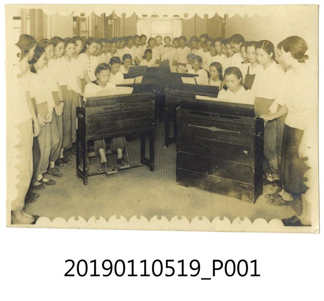 . 本文物年代不詳,為一黑白相片,其保存狀況良好。相片中皆為女學生,且分站兩旁。中央擺有8架直立式鋼琴,分別由八位女學生彈奏,琴架上擺有琴譜。