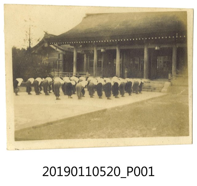 本文物為日治時期的黑白相片,其保存狀況良好。相片中可見一群人朝著神社參拜,相片中的人物皆取下帽子並行鞠躬禮。