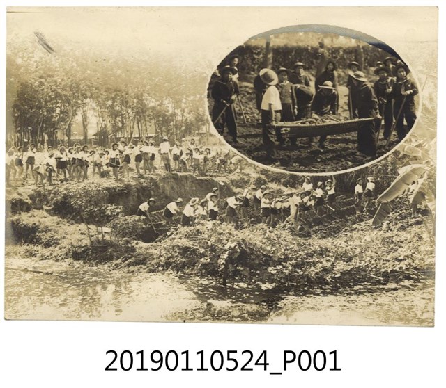 本文物年代不詳,為一黑白相片,其保存狀況良好,但上半部有些泛白。相片中可見一群女學生穿著短褲,且手拿鋤頭在整地。相片左下角有水體,右側為田壟。相片右上角有一橢圓形框格,框格中可見女學生抬著竹編的擔架,擔架上有塊莖類的植物。