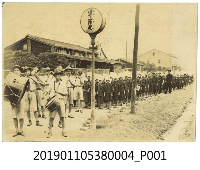 此文物為日本時代小學生戶外遊行照片,日治末期灌輸日本皇國精神於小學生的情景。從這照片中所呈現之人、事、物可看出一二,畫面中街上遊行隊伍最前端有手持大鼓演奏者,身後跟隨一群小學生,當中有人手持類似於治本國旗的圖樣。而此整批相片內容可看出日本皇民精神的灌輸透過許多方式,包含有舞蹈表演、戲劇演出、遊行等等。