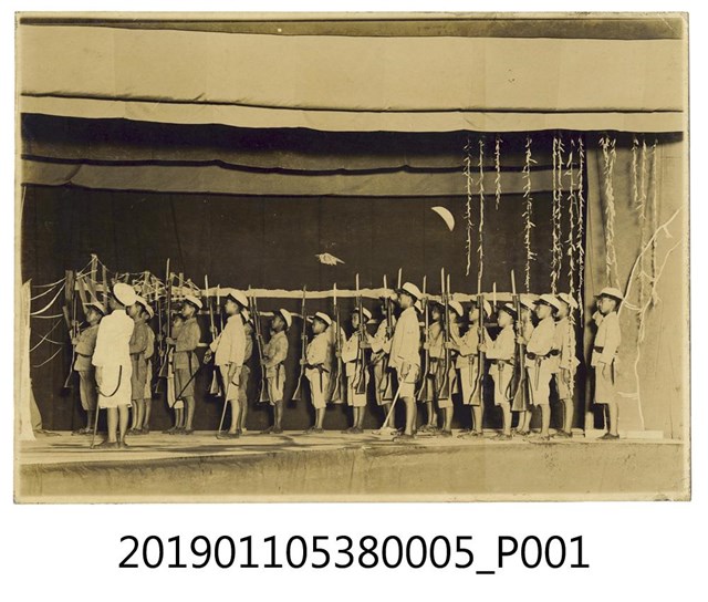 此文物為日本時代小學生舞台劇表演照片,是日治末期灌輸日本皇國精神於小學生的情景。從這照片中所呈現之人、事、物可看出一二,畫面中舞台上小學生可能正在進行舞台劇演出,人人身軍服,手持槍與刺刀。而此整批相片內容可看出日本皇民精神的灌輸透過許多方式,包含有舞蹈表演、戲劇演出、遊行等等。
