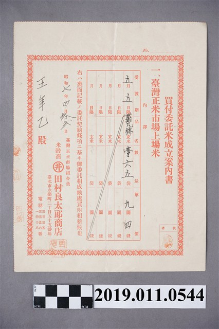 2019.011.0544 台北市永樂町田村良太郎商店的買付委託米成立案內書