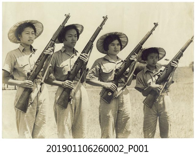 1.本件是參加中國青年反共救國團的女性,為橫幅黑白團體人物照片,照片主題內容為參加中國青年反共救國團的女性雙手抱扶長槍進行戰鬥訓練的樣貌。照片中的背景位在戶外草地中,草地上共有4名女性,女性人物按照身高呈橫排排列,畫面左側女性身高較高,至右側身高漸次。每名女性的髮型皆為長度齊耳之短髮,且穿著服裝一致,包含頭戴斗笠,身穿短袖襯衫,並將襯衫紮入卡其長褲中,腰間繫腰帶,顯現挺拔、有精神的外貌。除了服裝統一之外,4名女性的姿勢與表情也相同,皆為一手抱著槍管,一手托著槍尾,目視前方,神情嚴肅而認真。2.民國41年(1952)3月29日,蔣介石發表「告全國青年書」,同年10月成立中國青年反共救國團,納編於國防部之下,蔣介石為救國團首任團長,蔣經國則為主任。蔣介石設立中國青年反共救國團,期待能借鑒過去在中國時的失敗經驗,遷臺後期能以組織化的方式強化對青年學子的統治。救國團成立之初從事的活動主要有動態與靜態2類,動態活動如戰鬥訓練、登山、健行等;靜態活動如愛國教育、革命工作理論講習、反共任務等,整體以傳輸愛國、愛領袖意識為目標。救國團自民國41年(1952)至民國58年(1969)隸屬國防部,其後改隸內政部,民國78年(1989)隨著時代更迭,改設為社團法人組織。