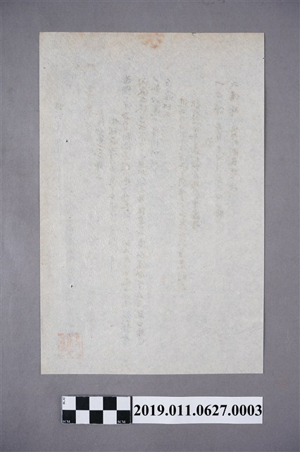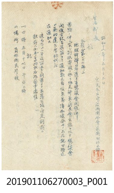 1.皇民奉公會溪湖街分會長岡田治之助發布地理師擇日師道士等懇談會開會通知,是一張單面、採直式書寫的藍色墨水手寫字跡文書檔案,以日文書寫,年代為昭和18年(1943)5月13日,由皇民奉公會溪湖街分會長岡田治之助發布,右下角並有皇民奉公會溪湖街分會長岡田治之助之朱方印。本件文書具有正式公文號「奉溪分第一六七號」,內容大致為通知地理師、擇日師、道士等相關從業人員參加懇談會,開會通知文書左方末2行記有「日時五月十七日午后二時」、「場所員林國民學校」,可從而得知實際開會時間與舉行地點。文書右上方另有淺藍色手寫字跡,註記「生活部長」。2.昭和12年(1937),日本對外發動戰爭,對日本國內提出「國民精神總動員」之喊話,對臺灣啟動皇民化運動,以殖民地人民能「皇國臣民化」為目標。在宗教政策上,最主要的方針是積極推展國家神道教,並同時抑制傳統信仰發展,包含推動正廳改善運動、要求人民參拜神社,以及推動寺廟整理運動,裁併地方寺廟等等。昭和16年(1941),皇民奉公會成立,皇民化運動轉為更加積極的奉公運動,宣揚尊皇敬神的精神。在地方組織上,各州、廳、市、郡、街、庄依序設立奉公會支部、分會、區分會、部落會與奉公班,由地方官員兼任奉公會地方組織首長。工作內容上,奉公會除了宣傳為國奉獻的義務,辦理徵兵相關事宜,在生活上也積極宣導婚喪禮儀基準、戰時節約消費、生活簡樸化等政策。本件文書即可見到奉公會積極與地理師、擇日師、道士等相關從業人員商談婚禮葬儀基準與實踐、破除迷信、生活節約等相關議題。