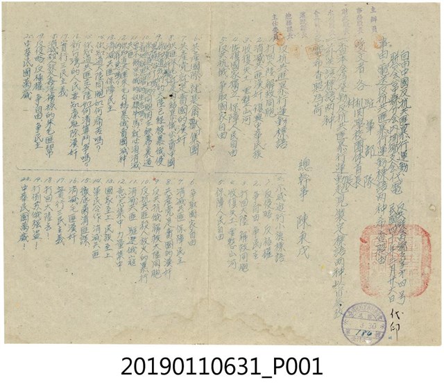 自由中國反抗共匪暴行運動聯合會台中縣分會內埔鄉支會代電:電送反抗共匪暴行運動標語兩種