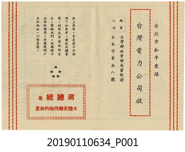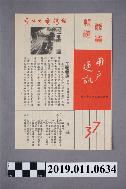 此物件為一紙質小冊,由臺灣電力公司於1964年1月印發,名為《用戶通訊》,內容包含〈一、工程報導──南部火力發電機簡介〉、〈二、業務報導──(1)加速供電推行簡報〉、〈二、業務報導──(2)記取「安」字標記,可策用電安全〉、〈二、業務報導──(3)甚麼叫做「一度電」?〉、〈二、業務報導──(4)路燈之貢獻〉、〈二、業務報導──(5)密告檢舉私設用電有奬金嗎?〉、〈二、業務報導──(6)竊電引起停電,籲請用戶合作〉、〈三、敬請注意用電安全〉、〈四、問題解答〉,背面則有對臺灣電力公司的回覆方式,且有「蔣總統是大陸苦難同胞的救星」標語。本書主要內容為臺灣電力公司對用戶發行的相關業務介紹等。 此件的臺灣電力公司,於1946年5月1日成立。在1946年3月20日,「臺灣電力接管委員會」接管日治時期的供電公司「臺灣電力株式會社」,並於4月6日接管委員會與臺灣省行政長官公署簽訂「臺灣工礦事業合作大鋼」確立接管規範,1946年5月1日「臺電」於是成立。 蔣中正的形象在臺灣以各種方式塑造起來,如建立人像、於重要場域懸掛照片、加入課程教育、創作歌曲、道路命名甚至於制定節日,並且讓蔣中正、蔣經國統領的國民黨政府鞏固統治。對此民間也發出反對的聲音,如雷震創立的《自由中國》於1956年10月31日出版的「祝壽專號」發出社論認為「蔣公」應該卸下大任,設立繼任人才的選拔方式以及內閣制的確立,應作「無智、無能、無為」的元首,而在雷震的私人日記中則有對「蔣公華誕」這樣領袖崇拜的行為進行批判。(周俊宇。2008。467-471)。