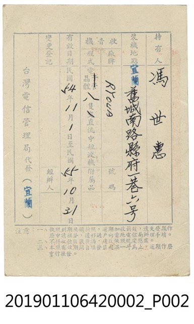 1.本件為馮世惠廣播收音機執照,外觀呈長方形,紙質,雙面印刷,正面印有「廣播收音機執照」、「理(統)字 No 018596」等字樣及紅色「執照專用交通部印」,背面印有「台灣電信管理局」代發(宜蘭)」字樣,手寫登錄使用者為「馮世惠」,裝機地點為「宜蘭舊城南路縣府一巷六號」,收音機型式為「RYOUA牌電晶體八隻直流中短波機」,及有效日期「民國54年11月1日至民國55年10月31日」等資訊。