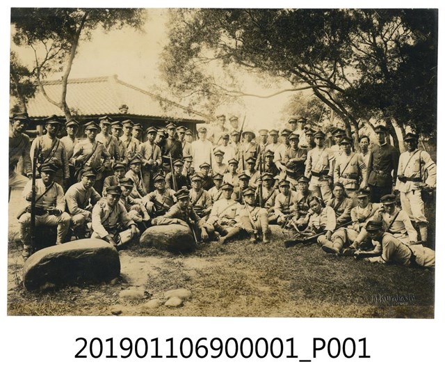 1. 臺北帝國大學醫學部學生軍訓活動照片組,是一張橫幅黑白團體活動照片,照片主題為日治時期臺北帝國大學醫學部學生進行戶外軍事訓練活動的情景。照片中的人物著裝大致相同,以穿著長袖立領排扣襯衫搭配卡其褲之制服為主,頭上皆戴著鑲有校徽的大學生角帽,腳穿戰鬥靴,腰上繫著彈藥盒,並配有戰爭時期為面對隨時需要應付戰爭到來、用以提升肌力與耐力的「腳絆」(綁腿),部分學生配有背帶,並手持長槍,部分學生配戴眼鏡。由學生角帽上的校徽樣式可知,本組照片中的人物為臺北帝國大學的學生。照片中的人物聚集在相機鏡頭前,錯落排成4排,前方2排或坐或臥,後方2排交錯站立,背景位在一房屋前的庭院之中,前景可見庭院中的造景石,學生皆看向鏡頭,為此次戶外軍訓活動留影紀念。2.臺北帝國大學創校時即被定位為配合日本政府施政方向──協助「南進政策」實施,因此臺北帝國大學設立的講座、部門課程大多以熱帶或殖民地適應性等議題為主題。到了1930年代,日本政府正積極為對外擴張做準備,臺北帝國大學也積極配合政府政策,新創設的醫學部便是明顯的例子。臺北帝國大學醫學部設立於昭和11年(1936),以發展熱帶醫學研究為核心課題,例如醫學部內設置的講座,即以研究熱帶與亞熱帶的衛生或疾病為主。昭和12年(1937),日本發動中日戰爭,臺灣也進入國家動員時期。臺北帝國大學醫學部在戰時動員體制之下,也專注於支援帝國擴張與部屬殖民地所需,研究議題與方向包含熱帶馴化問題,以及作為殖民地的熱帶地區可能遭遇的衛生問題與各種疾病,如寄生蟲、瘧疾、毒蛇、幼兒夏季熱等。