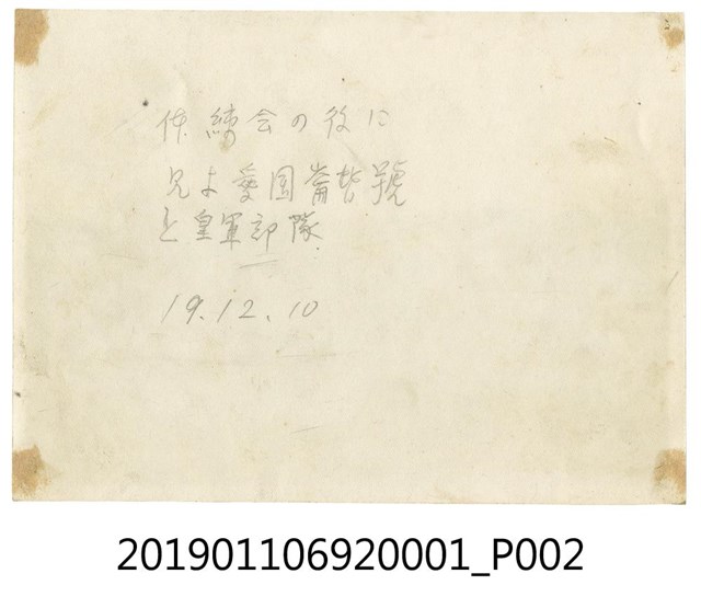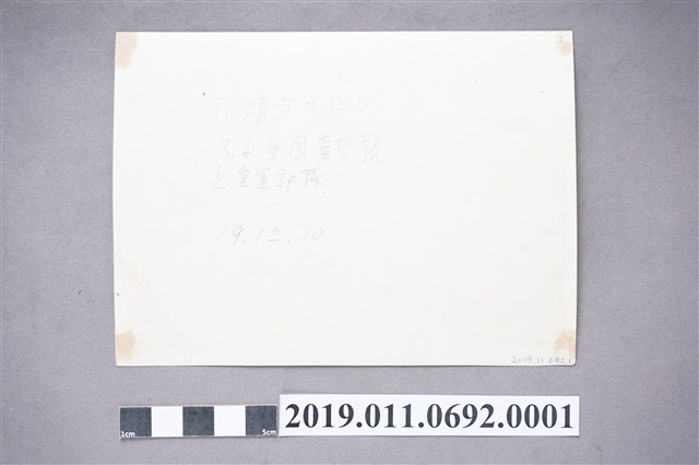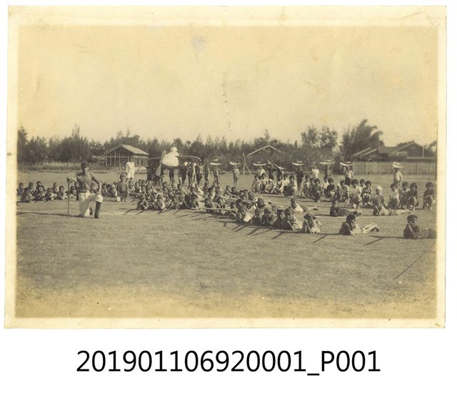 1.日治時期學校航空教育課,是一張橫幅黑白照片,照片主題是學校進行航空教育課程時的團體照。照片背景為在戶外操場,其中的人物活動主要有3部分,第1部分為學生排成1至3橫排,作匍匐姿勢,手持長管作為模型槍,進行臥射訓練;第2部分的學生排在臥射姿勢的學生後面,採取蹲姿或盤坐;第3部分的學生在前述2群學生後面,其中一群學生聯合扛起大型飛機模型,一旁排列站立的學生則高舉小型的飛機模型至頭頂展示。照片中的教師或教練位在照片畫面左方,1位站立於大型飛機模型機翼旁,1位挺身、採半跪姿態,手持長棍。照片背面有鉛筆字跡,內容為:「体鍊会の後に兄よ愛国崙皆號と皇軍部隊 19.12.10」,從照片中的模型飛機課程與背面的字跡,推測本件照片拍攝日期為昭和19年(1944)。2.昭和12年(1937),日本開始對外發動戰爭,臺灣總督府也跟進時局,在校園中加強軍事教育。教育學生的軍事課程,包含防空演習、軍事操演、軍隊參訪等等。其中如飛行技術等西方科技,在教育課程中也從吸收新知,變成帶有軍事色彩與國家意識形態的軍事科技課程。在教材方面,以公學校的國語科課程為例,便能看到課文增加了前線將士的奮戰事蹟與戰爭即時報導等內容,此外,國語科課程也有講授模型飛機與滑翔機訓練課程,而藝能科也有教授繪製飛機、製作竹製滑翔機模型與木製或竹、紙質等材質之具有動力裝置的飛機模型。期望在國家需要人員時,這些聽過講習、並受到基礎訓練的學生能夠在進一步接受飛行訓練後成為日本皇軍,在第一線為國奮戰。在課外活動上,也因應戰時體制,以表演讚揚日本軍隊的戲劇、歌唱軍歌、與祝賀或追悼從軍的家人為主。