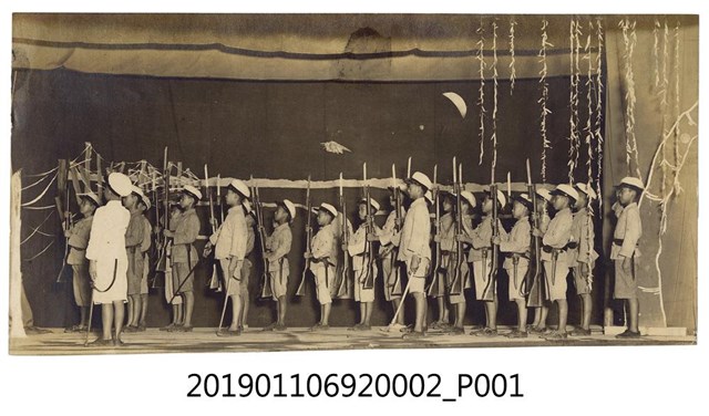 1.日治時期學生學藝活動,是一張橫幅黑白照片,照片外觀呈窄長方形,長15.4公分,寬7.8公分,照片主題是學生團體在舞臺上表演軍事操練或謳歌日軍等戲劇、歌唱節目的情景。照片背景之舞臺佈景可見月亮、柳枝、樹幹等等,畫面上方與右側皆設置帷幕。舞臺上錯落排列3排學生,學生皆著襯衫、卡其褲、腰間繫腰帶,上衣紮進短褲中,頭戴大檐帽,衣著整齊統一,並皆面朝畫面左側。大部分的學生手持刺槍,在舞臺前方的學生持軍刀,末端學生無持槍。持刺槍的學生雙手舉槍,將刺槍舉至胸前;持軍刀的學生將軍刀向下擺至身前;無持器械的學生則右手手指併攏,舉至眉間,整體皆代表敬禮的姿勢。2.昭和12年(1937),日本開始對外發動戰爭,臺灣總督府也跟進時局,在校園中加強軍事教育。教育學生的軍事課程,包含防空演習、軍事操演、軍隊參訪等等。其中如飛行技術等西方科技,在教育課程中也從吸收新知,變成帶有軍事色彩與國家意識形態的軍事科技課程。在教材方面,以公學校的國語科課程為例,便能看到課文增加了前線將士的奮戰事蹟與戰爭即時報導等內容,此外,國語科課程也有講授模型飛機與滑翔機訓練課程,而藝能科也有教授繪製飛機、製作竹製滑翔機模型與木製或竹、紙質等材質之具有動力裝置的飛機模型。期望在國家需要人員時,這些聽過講習、並受到基礎訓練的學生能夠在進一步接受飛行訓練後成為日本皇軍,在第一線為國奮戰。在課外活動上,也因應戰時體制,以表演讚揚日本軍隊的戲劇、歌唱軍歌、與祝賀或追悼從軍的家人為主。