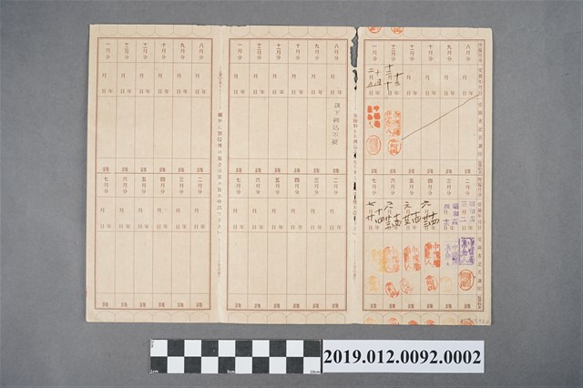 此為昭和13-14年(1938-1939年)期間,許文亮之保險料領收帳,即為保險金繳交證明,保險金為每月2元,此份領收帳背面尚未蓋滿。