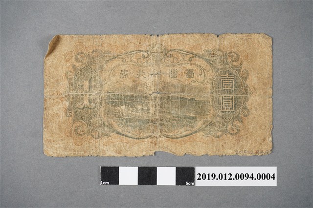 此為日治時期銀元券,面額為壹圓,由臺灣銀行發行,紙鈔已破損斑駁嚴重,背面圖案幾不可見。