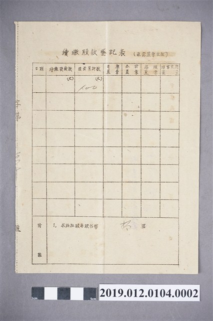此為許學成民國36年(西元1947年)認購之股票,編號為30,股數為10股,總值100元,背面有續繳股款登記表。