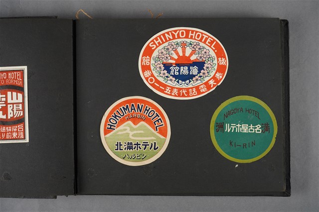 本文物年代為日治時期,為瀋陽地區一處旅館廣告。廣告為橢圓形紙張,紙張中央印有太陽旗,其周圍開滿粉紅色花朵。文物印有「SHINTO HOTEL 奉天……」及「瀋陽館」等字。