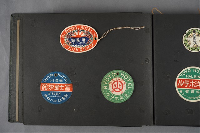 本文物年代為日治時期,為大連地區一處旅館的廣告吊牌。吊牌為圓形紙張狀,中央上方處有一圓形孔洞。文物外環處印有「RYOTO HOTEL」、「遼東ホテル」;內部印有「大連」及「R」、「H」等字。