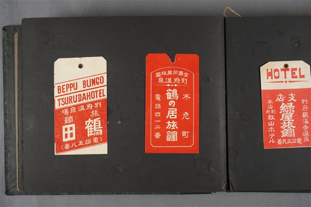 本文物為1930年代物品,為日本別府地區溫泉旅館的廣告。文物為紅色紙張,中央上方處有破損。文物印有「全國同盟旅館 別府溫泉」、「不老町 鶴の居旅館」等字。