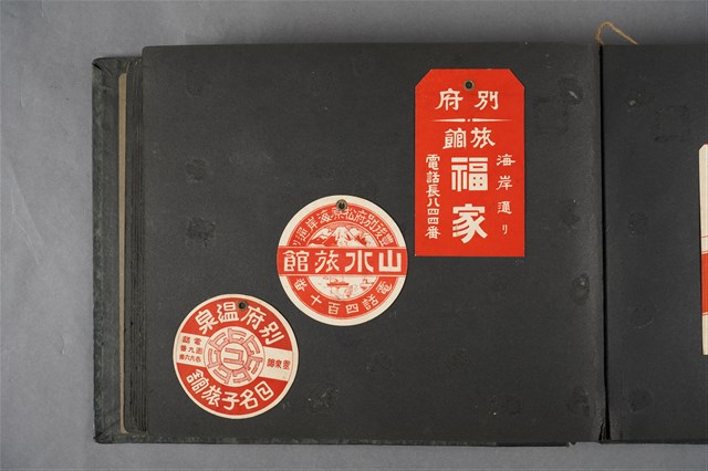 本文物為1930年代物品,為日本別府溫泉旅館的廣告。文物為圓形紙張,中央上方有圓形孔洞。紙張印有「別府溫泉」、「日名子旅館」、「靈泉館」等字,文字中央印有圖案。