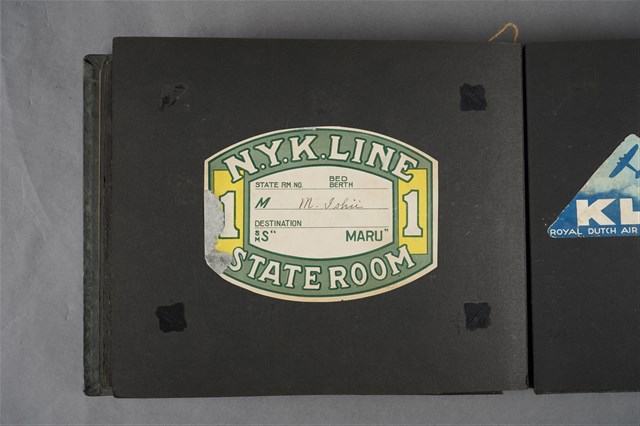 本文物為1930年代物品,為日本郵船頭等艙的貼紙。文物為上下圓弧狀的紙張,黏貼於黑色收藏冊中,收藏冊的四個角落有黑色物體。文物上下印有「N.Y.K LINE」、「STATE ROOM」,中央為旅客資料,如床位號碼、目的地等,其中一欄位寫有「M. Tshii」的草寫。