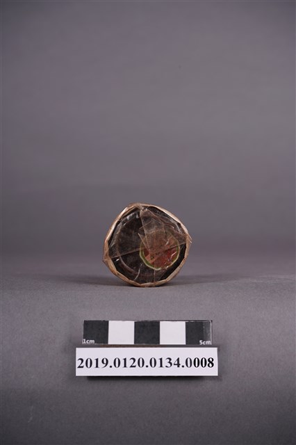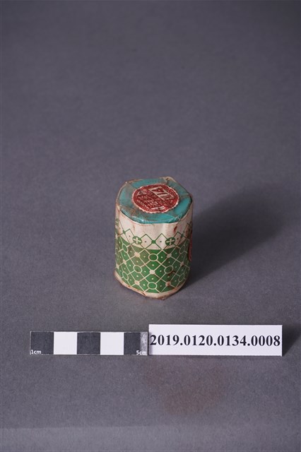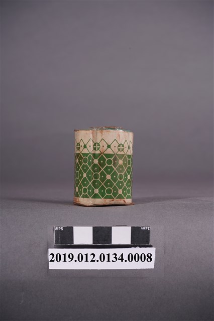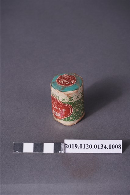 本文物為染料罐(海老茶色),外觀花紋為綠色,可用於木棉、麻、絹、人工絹等,罐頂有編號NO.14。染料顏色為海老茶色,海老茶色名稱為日本所取,顏色為紅茶色,也稱作葡萄茶色。罐外寫有家庭用染料,染料性質為直接染料,直接染料所指的是能直接溶於水,無需使用其他添加物。