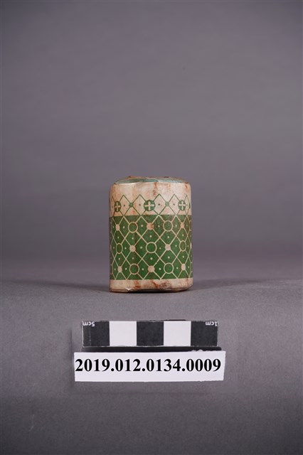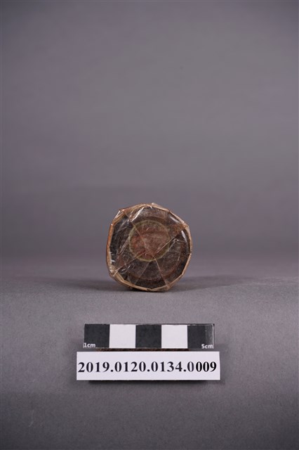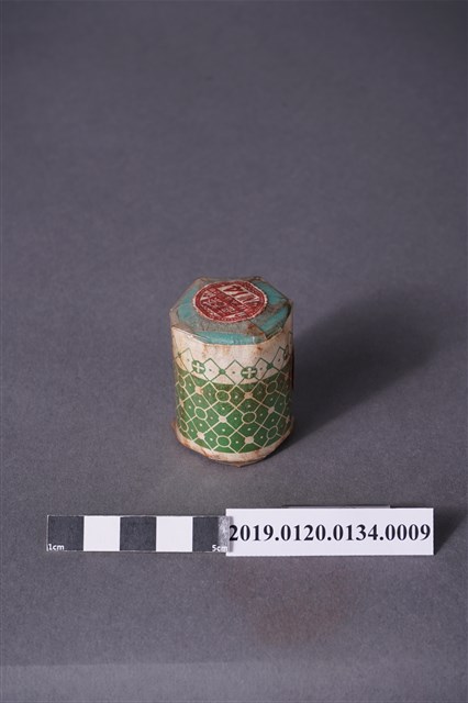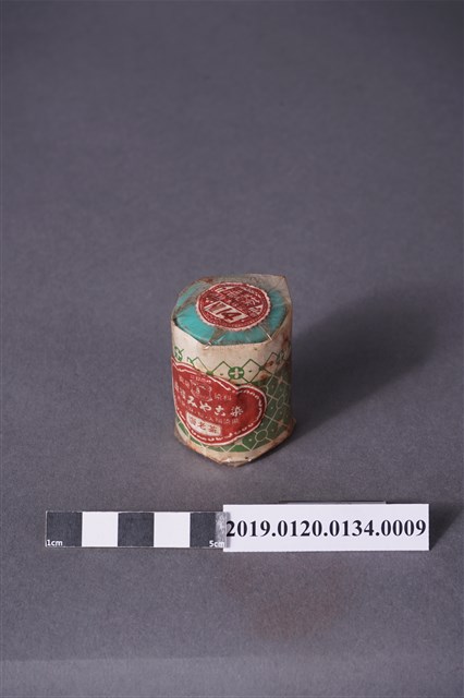 本文物為染料罐(海老茶色),外觀花紋為綠色,可用於木棉、麻、絹、人工絹等,罐頂有編號NO.14。染料顏色為海老茶色,海老茶色名稱為日本所取,顏色為紅茶色,也稱作葡萄茶色。罐外寫有家庭用染料,染料性質為直接染料,直接染料所指的是能直接溶於水,無需使用其他添加物。