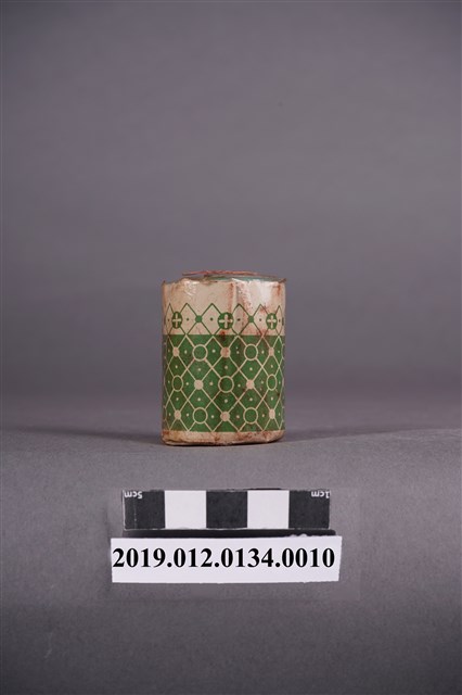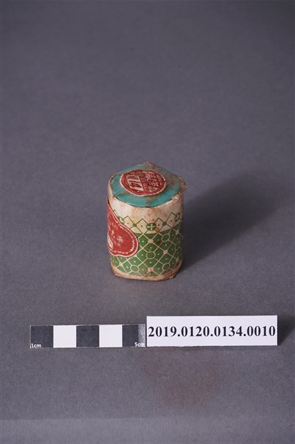 本文物為染料罐(海老茶色),外觀花紋為綠色,可用於木棉、麻、絹、人工絹等,罐頂有編號NO.14。染料顏色為海老茶色,海老茶色名稱為日本所取,顏色為紅茶色,也稱作葡萄茶色。罐外寫有家庭用染料,染料性質為直接染料,直接染料所指的是能直接溶於水,無需使用其他添加物。