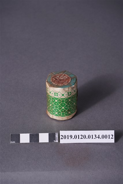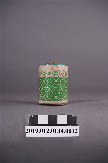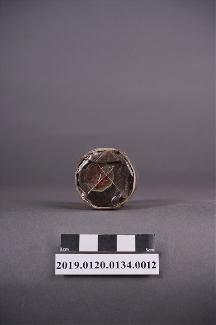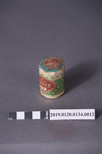 本文物是日治時期家庭使用染料罐,色號14號海老茶色,屬於直接みやこ染,みやこ染指得是可以在家庭使用的染料,該色號染料可直接用於木棉、麻、絲製品、人造絲。本文物外觀包裝大致完整,包裝有兩處商標,罐子上頭商標為「海老茶,直接木棉絹染用,NO.14」。罐身商標內容由左至右為「家庭染料,直接みやこ染,木棉、麻、絹、人絹染用,海老茶」。