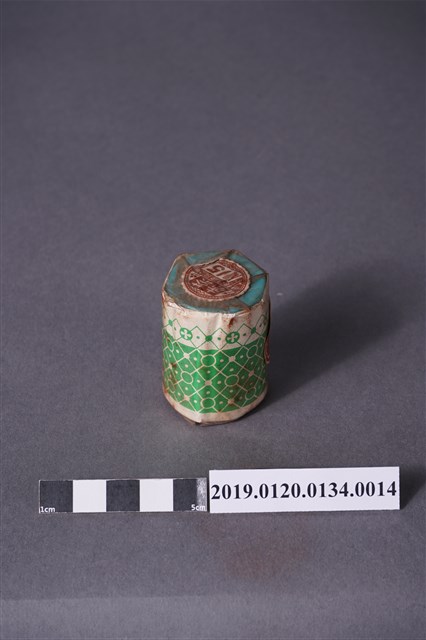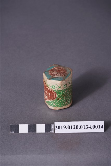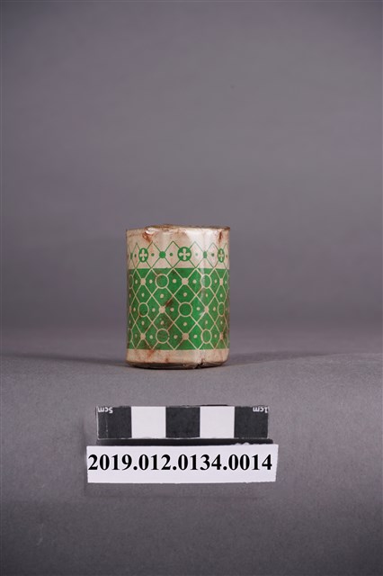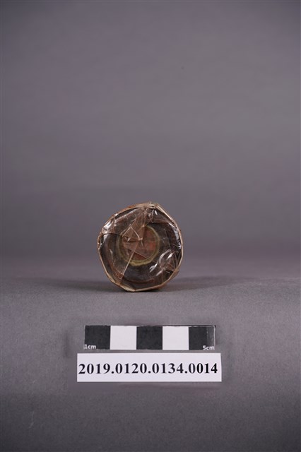 本文物是日治時期家庭使用染料罐,色號15號紅棕色,屬於直接みやこ染,みやこ染指得是可以在家庭使用的染料,該色號染料可直接用於木棉、麻、絲製品、人造絲。本文物外觀包裝大致完整,包裝有兩處商標,罐子上頭商標為「赤茶,直接木棉絹染用,NO.15」。罐身商標內容由左至右為「家庭染料,直接みやこ染,木棉、麻、絹、人絹染用,赤茶」。