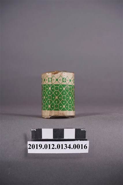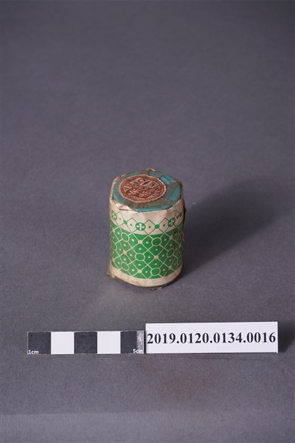 本文物是日治時期家庭使用染料罐,色號15號紅棕色,屬於直接みやこ染,みやこ染指得是可以在家庭使用的染料,該色號染料可直接用於木棉、麻、絲製品、人造絲。本文物外觀包裝大致完整,包裝有兩處商標,罐子上頭商標為「赤茶,直接木棉絹染用,NO.15」。罐身商標內容由左至右為「家庭染料,直接みやこ染,木棉、麻、絹、人絹染用,赤茶」。
