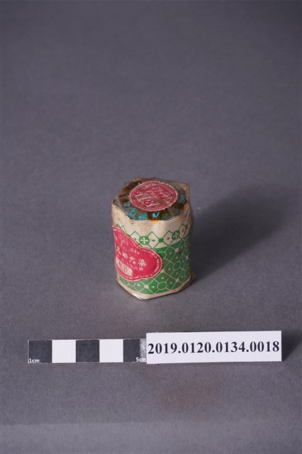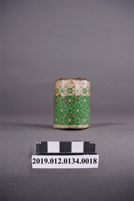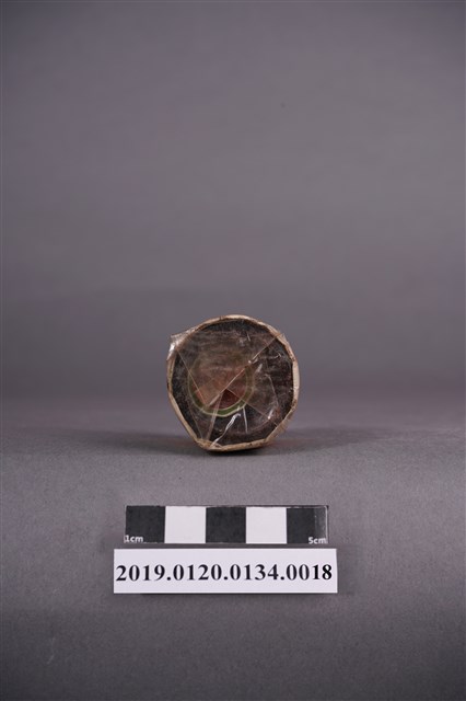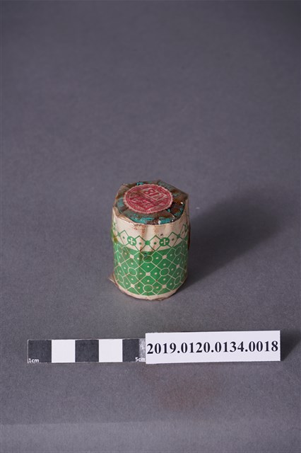 本文物是日治時期家庭使用染料罐,色號18號牡丹色,屬於直接みやこ染,みやこ染指得是可以在家庭使用的染料,該色號染料可直接用於木棉、麻、絲製品、人造絲。本文物外觀包裝大致完整,包裝有兩處商標,罐子上頭商標為「牡丹,直接木棉絹染用,NO.18」。罐身商內容由左至右為「家庭染料,直接みやこ染,木棉、麻、絹、人絹染用,牡丹」。