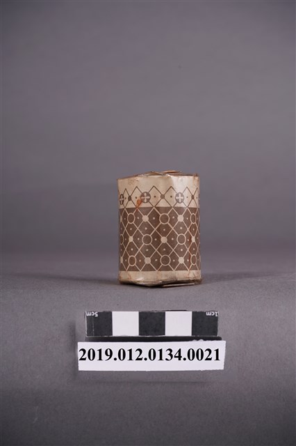 本文物是日治時期家庭使用染料罐,色號52號橘色,屬於酸性みやこ染,みやこ染指得是可以在家庭使用的染料,該色號染料可用於絲製品、毛、平織毛織品及尼龍。本文物外觀包裝大致完整,包裝有兩處商標,商標字跡模糊,罐子上頭商標為「ォレンジ,酸性絹、毛染用,NO.52」。罐身商內容由左至右為「家庭染料,酸性みやこ染,ナィロン、絹、毛用,ォレンジ」。