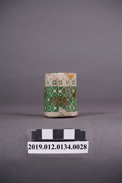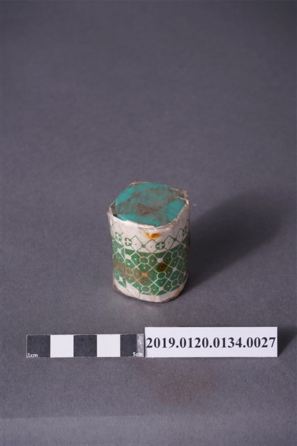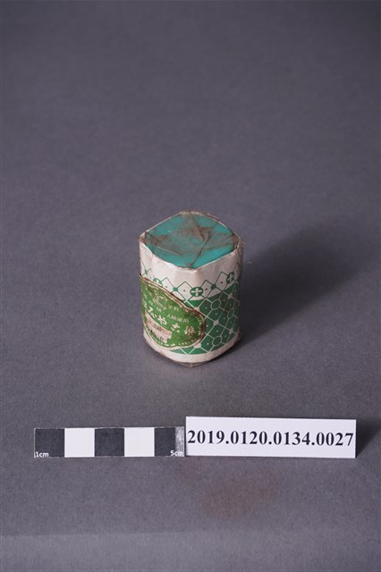 本文物是日治時期家庭使用染料罐,綠色,屬於直接みやこ染,みやこ染指得是可以在家庭使用的染料,該色號染料可直接用於木棉、麻、絲製品、人造絲。本文物外觀包裝大致完整,包裝有兩處商標,罐子上頭商標遺失。罐身商標內容為由左至右為「家庭染料,木棉、麻、絹、人絹染用,直接みやこ染,綠,4008」。