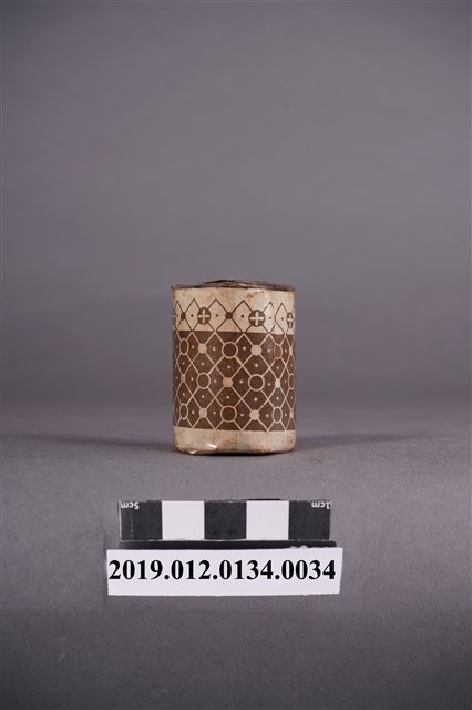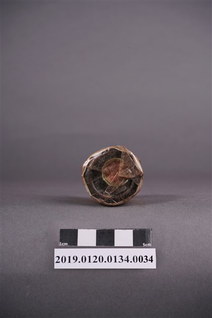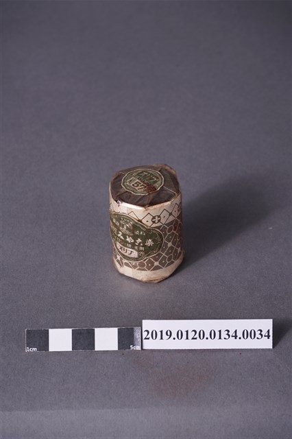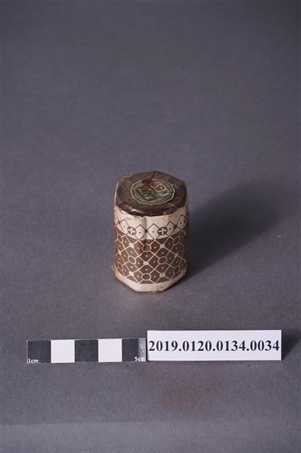 本文物是日治時期家庭使用染料罐,色號57號橄欖色,屬於酸性みやこ染,みやこ染指得是可以在家庭使用的染料,該色號染料可用於絲製品、毛、平織毛織品及尼龍。本文物外觀包裝大致完整,包裝有兩處商標,罐子上頭商標為「オリブ色,酸性絹毛染用,NO.58」。罐身商標內容由左至右為「家庭染料,酸性みやこ染,ナィロン、絹、毛用,オリブ色」。