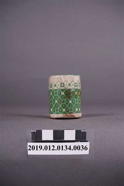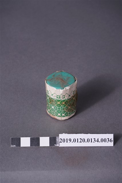 本文物是日治時期家庭使用青色染料罐,屬於直接みやこ染,みやこ染指得是可以在家庭使用的染料,該色號染料可直接用於木棉、麻、絲製品、人造絲。本文物外觀包裝大致完整,包裝有一處商標,罐身商標內容由左至右為「家庭染料,木棉、麻、絹、人絹染用,直接みやこ染,青,4008」。