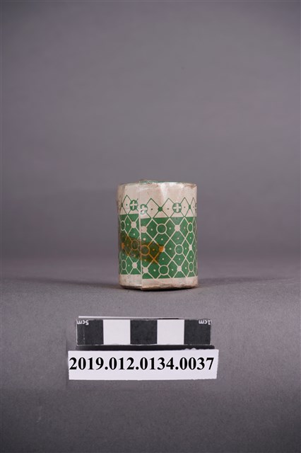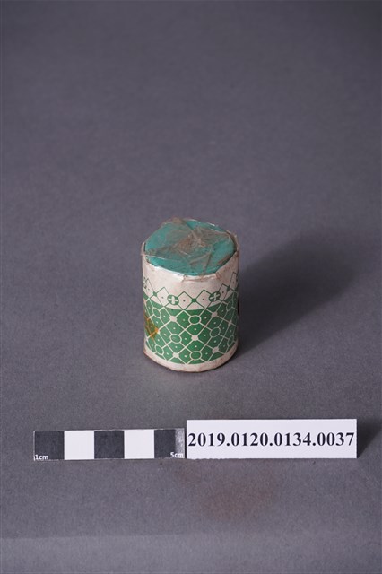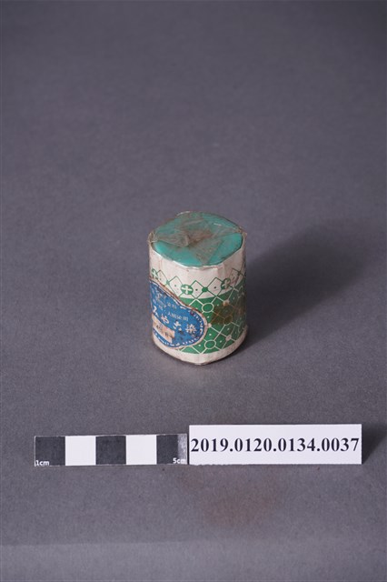 本文物是日治時期家庭使用青色染料罐,屬於直接みやこ染,みやこ染指得是可以在家庭使用的染料,該色號染料可直接用於木棉、麻、絲製品、人造絲。本文物外觀包裝大致完整,包裝有一處商標,罐身商標內容由左至右為「家庭染料,木棉、麻、絹、人絹染用,直接みやこ染,青,4008」。