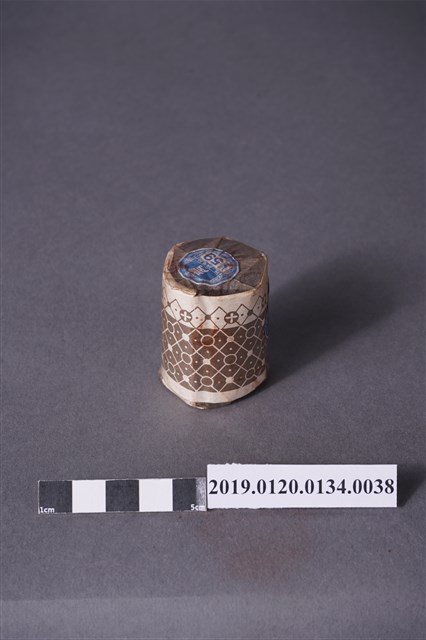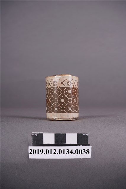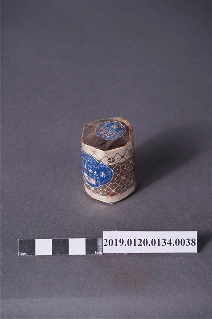 本文物是日治時期家庭使用染料罐,色號59號青色,屬於酸性みやこ染,みやこ染指得是可以在家庭使用的染料,該色號染料可用於絲製品、毛、平織毛織品及尼龍。本文物外觀包裝大致完整,包裝有兩處商標,罐子上頭商標為「青,酸性絹毛染用,NO.59」。罐身商標內容由左至右為「家庭染料,酸性みやこ染,ナィロン、絹、毛用,青色」。