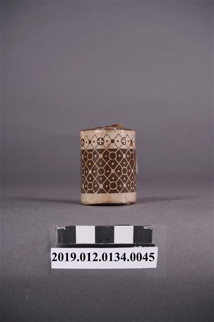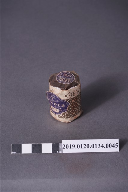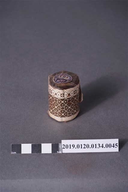 本文物是日治時期家庭使用染料罐,色號63號灰藍色,屬於酸性みやこ染,みやこ染指得是可以在家庭使用的染料,該色號染料可用於絲製品、毛、平織毛織品及尼龍。本文物外觀包裝大致完整,包裝有兩處商標,罐子上頭商標為「納戶,酸性絹毛染用,NO.63」。罐身商標內容由左至右為「家庭染料,酸性みやこ染,ナィロン、絹、毛用,納戶」。