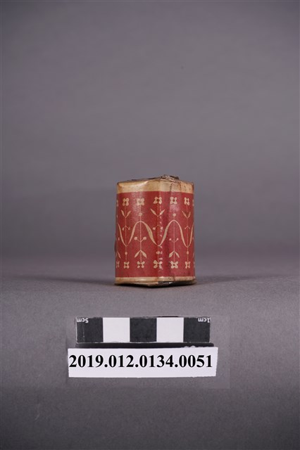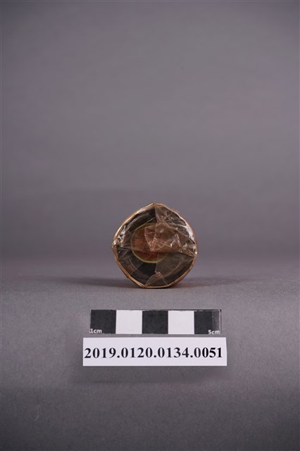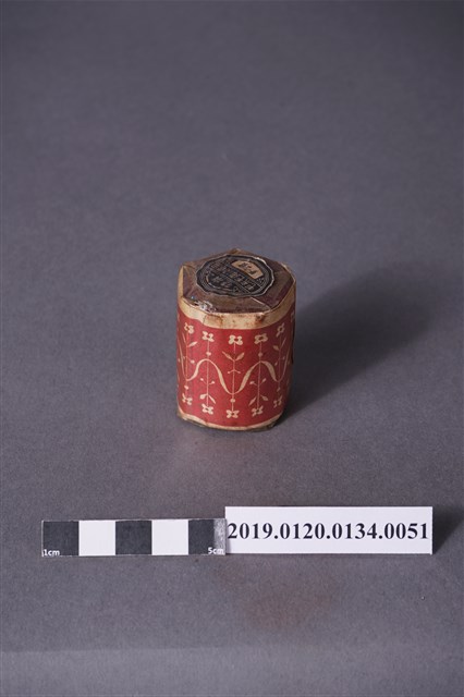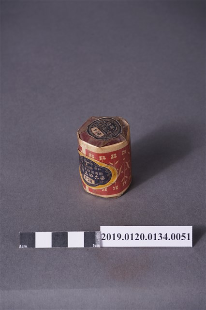 本文物是日治時期家庭使用染料罐,海軍藍色,屬於毛織染專用。本文物外觀包裝大致完整,包裝有兩處商標,罐子上頭商標為「特撰毛系毛織染專用,サージ紺」。罐身商標內容由左至右為「家庭染料,毛系毛織染專用,特撰みやこ染,サージ紺」。