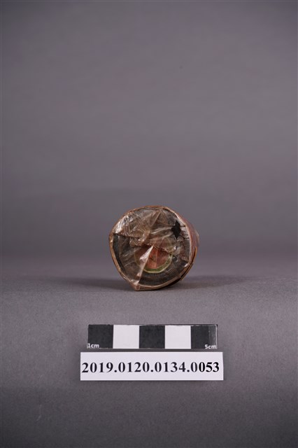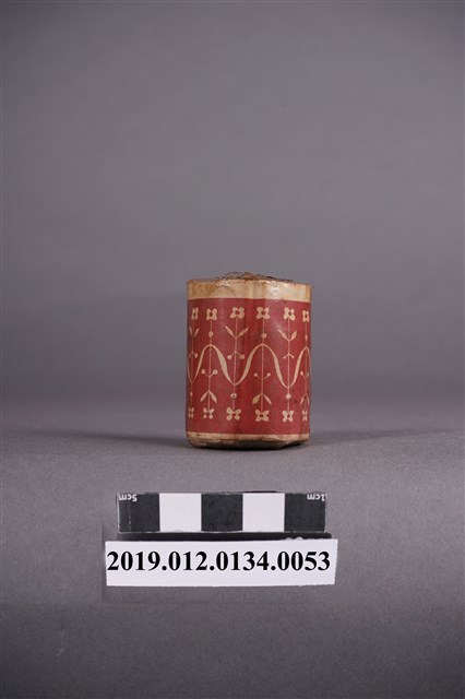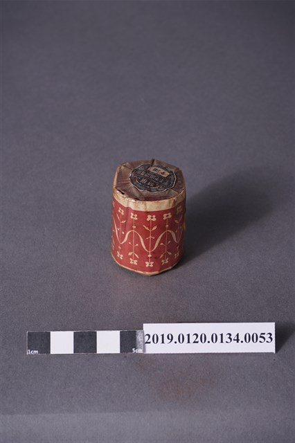 本文物是日治時期家庭使用染料罐,海軍藍色,屬於毛織染專用。本文物外觀包裝大致完整,包裝有兩處商標,罐子上頭商標為「特撰毛系毛織染專用,サージ紺」。罐身商標內容由左至右為「家庭染料,毛系毛織染專用,特撰みやこ染,サージ紺」。