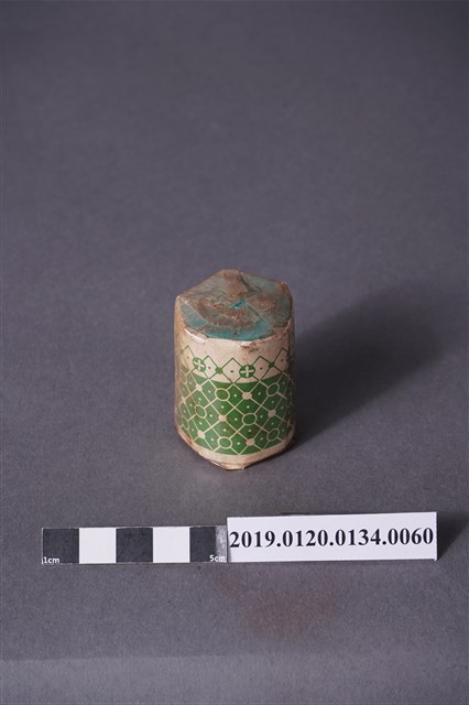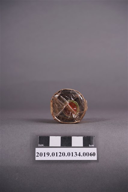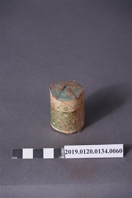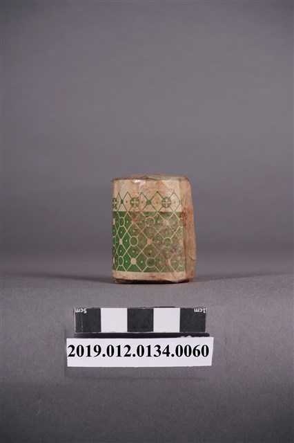 本文物是日治時期家庭使用染料罐,みやこ染指得是可以在家庭使用的染料,本物件商標遺失以致無法得知該染料顏色與色號,染料罐以綠色為基底,上面有幾何與線條花紋。
