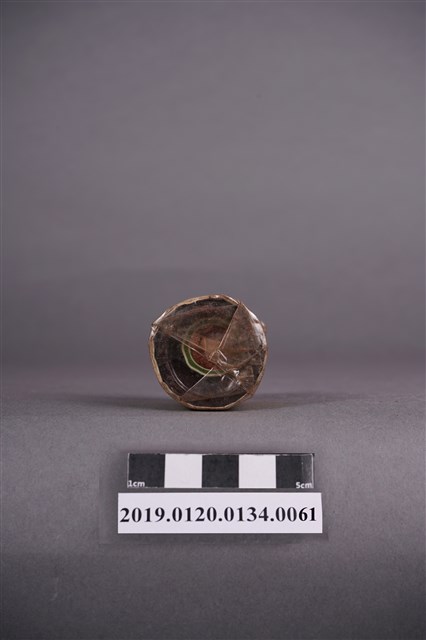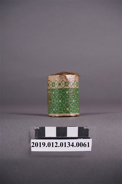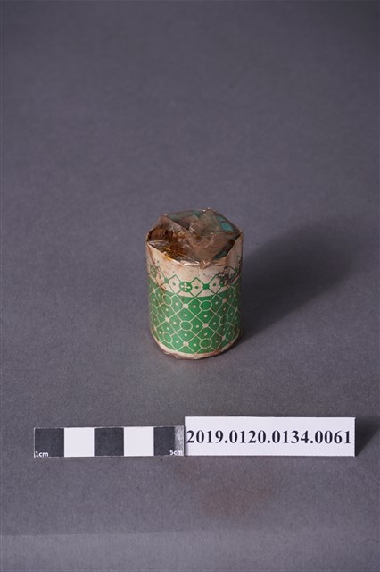 本文物為日治時期的染料,為罐裝物品。染料罐外圈以印有綠色紋路的紙張包住,罐子上亦可見塑膠材質的包裝。包裝紙有多處黑色髒汙,塑膠材質部分亦有黃色污漬。