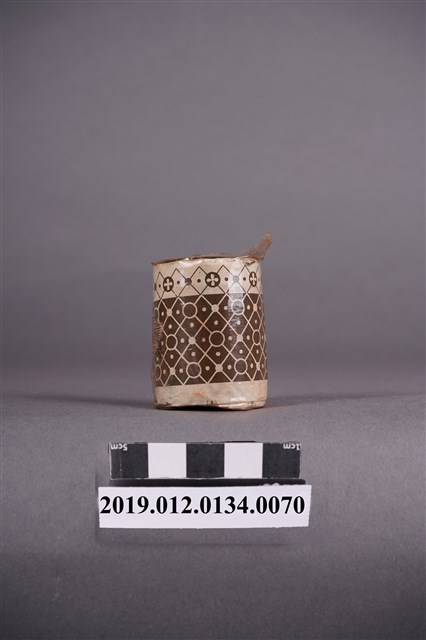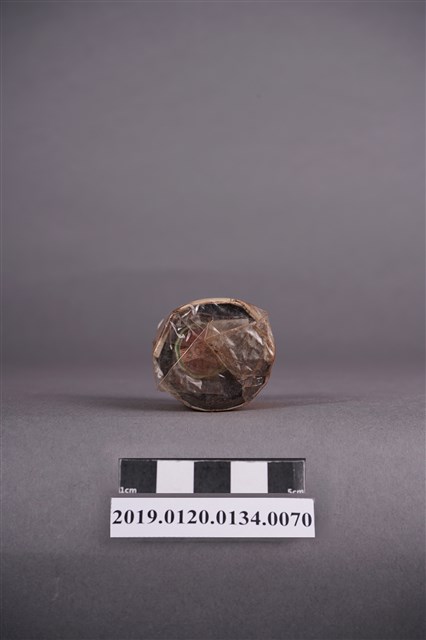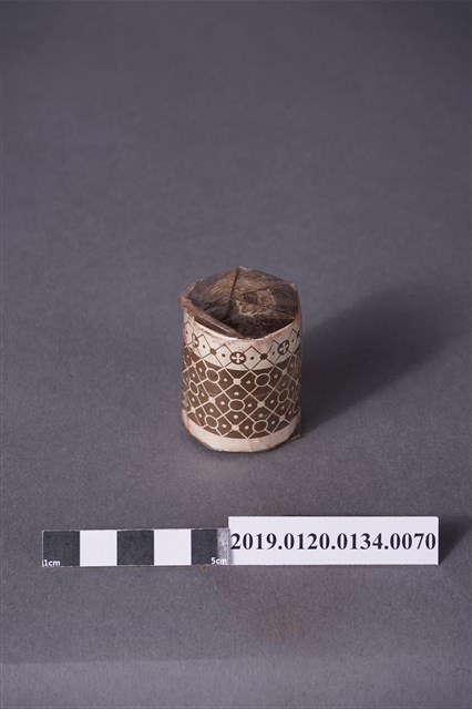 本文物為日治時期的染料,為罐裝物品。染料罐外圍以印有深咖啡紋路的紙張包住,再以塑膠材質包裝。瓶身包裝紙有小面積白色部分,瓶蓋處的包裝有鬆脫跡象。