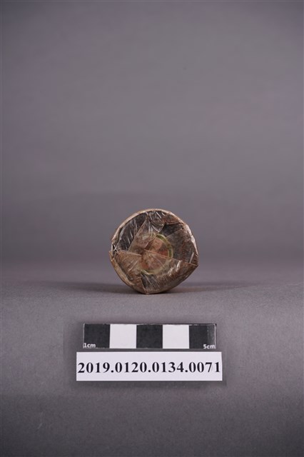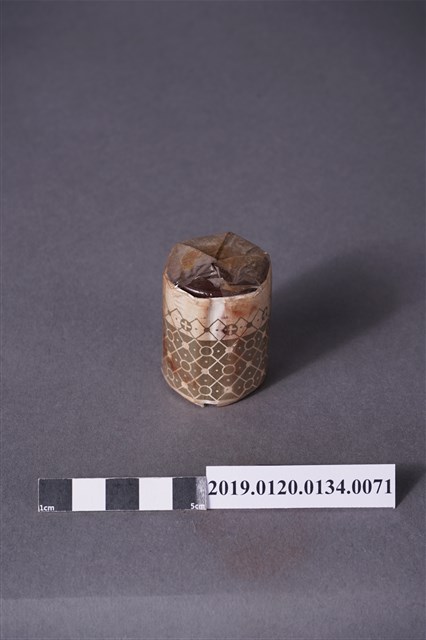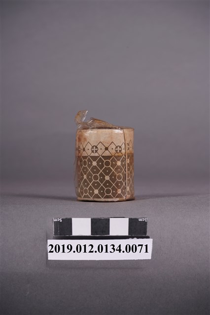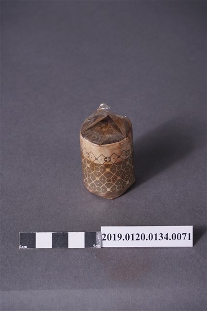本文物為日治時期的染料,為罐裝物品。染料罐外圍以印有深咖啡紋路的紙張包住,再以塑膠材質包裝。瓶身的包裝紙顏色偏淺,瓶蓋處的包裝有明顯鬆脫。