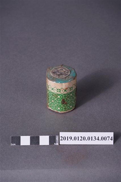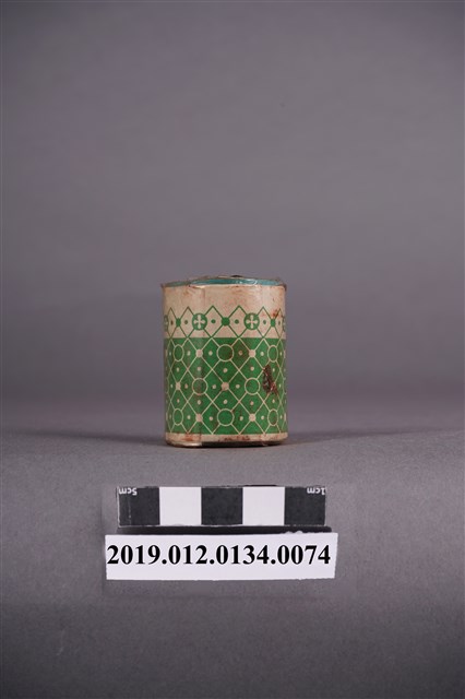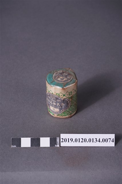 本文物為日治時期的染料,為罐裝物品。染料罐外圍以印有綠色花紋的紙張包住,罐子正面印有「直接みや古染」、「木綿、麻、絹、人絹染用」、「鼠」及「家庭染料」等字,文字中央印有燈塔的圖案。瓶蓋為藍色,其上方紙張印有「鼠」及「N.4」等字。