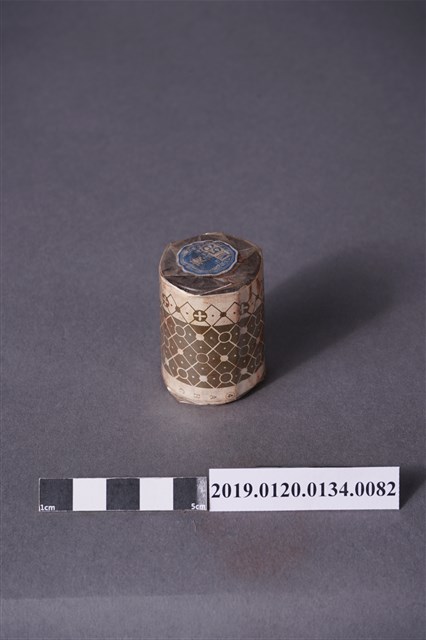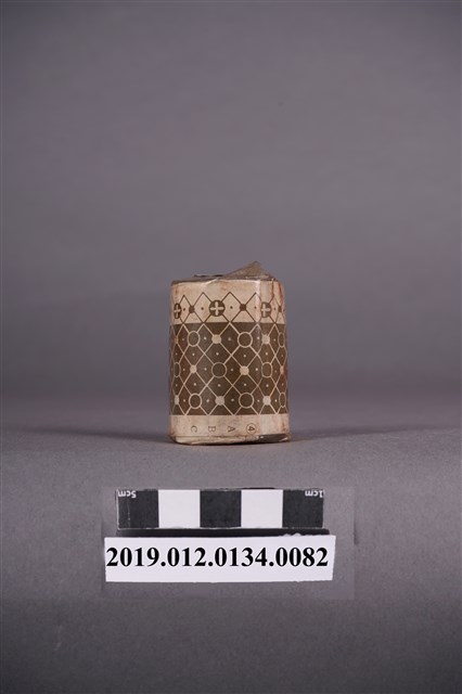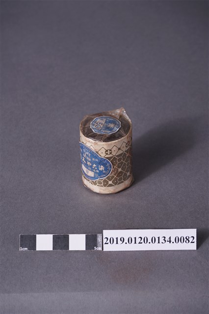 本文物為日治時期的染料,為罐裝物品。染料罐外圍以印有黑色花紋的紙張包住,罐子正面貼著印有「酸性みや古染」、「ナイロン、絹、毛用」、「青」及「家庭染料」等字的紙,並印有一燈塔樣。瓶蓋處的紙張印有「酸性、絹毛染用」及「NO.59」等字。