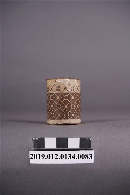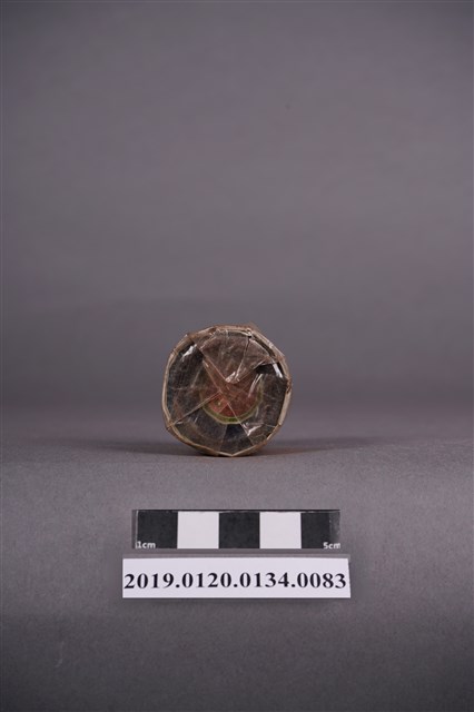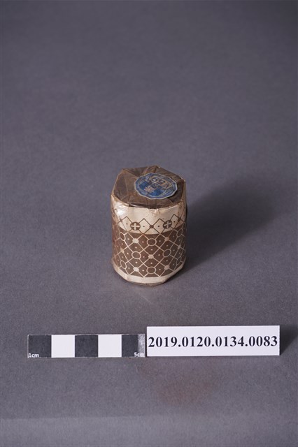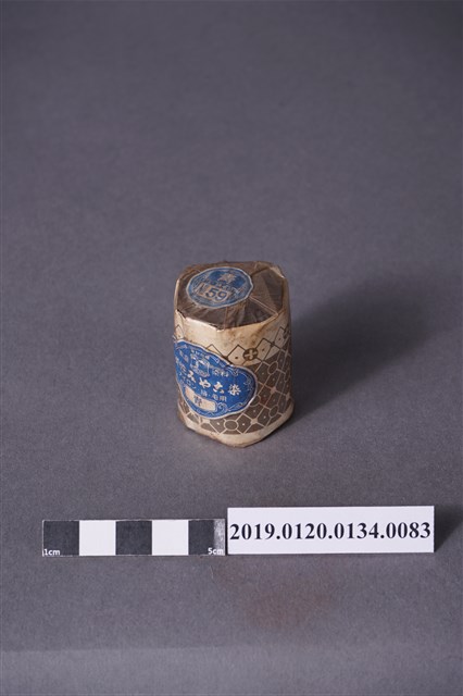 本文物為日治時期的染料,為罐裝物品。染料罐外圍以印有黑色花紋的紙張包住,罐子正面貼著印有「酸性みや古染」、「ナイロン、絹、毛用」、「青」及「家庭染料」等字的紙,並印有一燈塔樣。瓶蓋處的紙張印有「酸性、絹毛染用」及「NO.59」等字。
