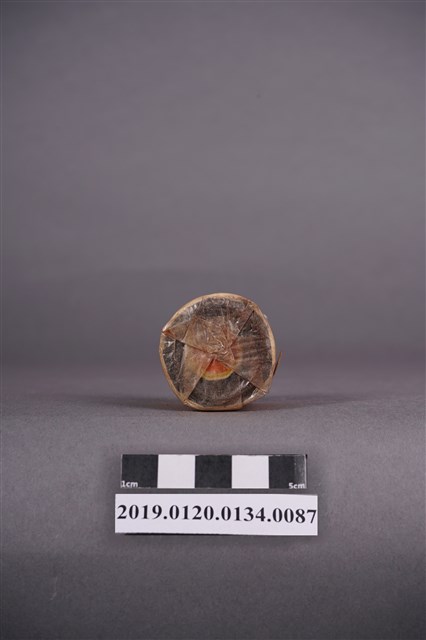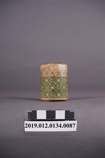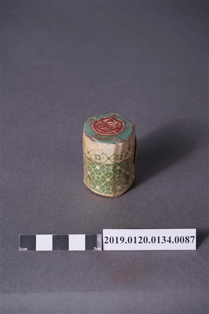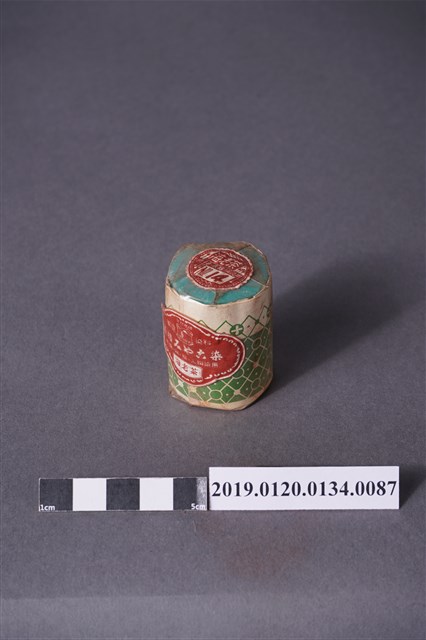 本文物為日治時期的染料,為裝有深紅色的染料罐。染料罐外圍以印有綠色花紋的紙張包住,罐子正面貼有紅色紙張,並印有「直接みや古染」、「木綿、麻、絹、人絹染用」、「海老茶」及「家庭染料」等字的紙,並印有一燈塔樣。瓶蓋處的紙張印有「直接……」及「NO.14」等字。